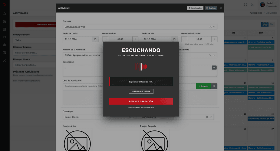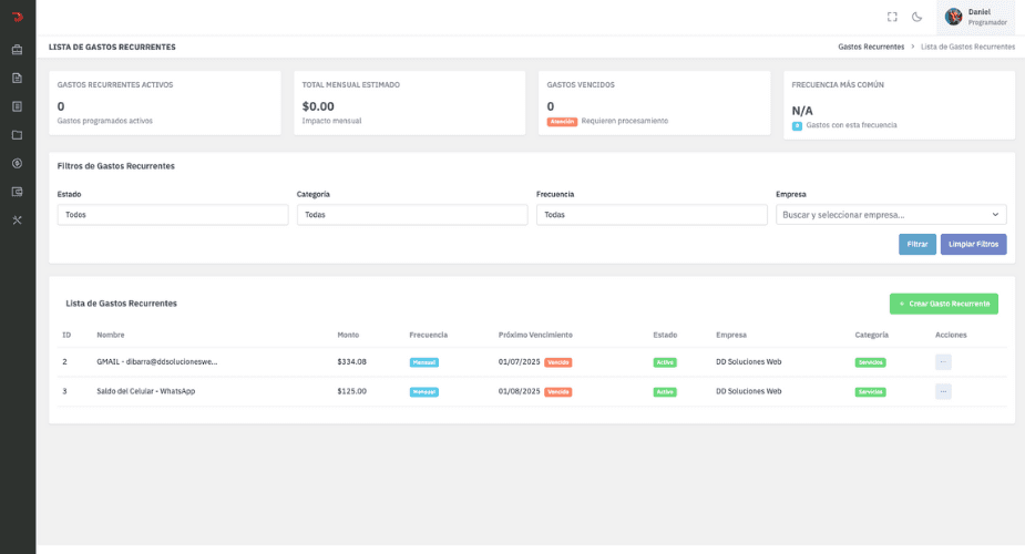 El equipo de DD Soluciones Web desarrolló una aplicación web robusta para la gestión interna de la empresa, diseñada para administrar proyectos de páginas y aplicaciones web de clientes, generar cotizaciones, controlar facturación, gestionar pagos y llevar registro completo de ingresos, egresos y proveedores.
